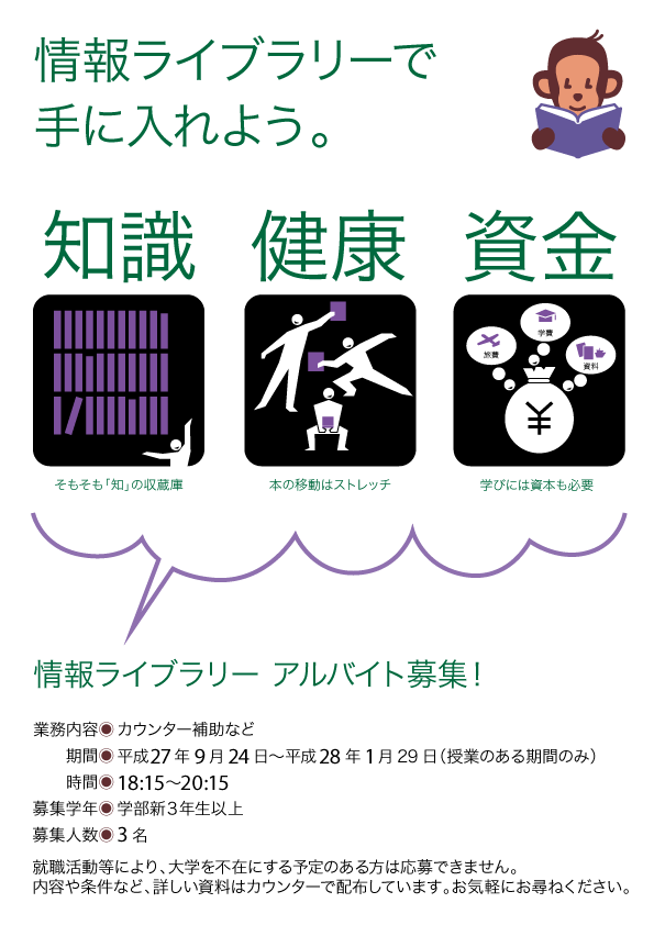 情報ライブラリーでは、後期のカウンター作業補助員3名を募集しています。